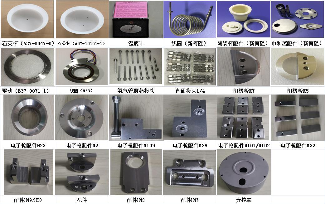 光學鍍膜精密配件:電子槍燈絲、離子源燈絲、鎢舟、鉬舟、坩堝、高溫膠帶、晶振片、電子槍頭、光控片等。